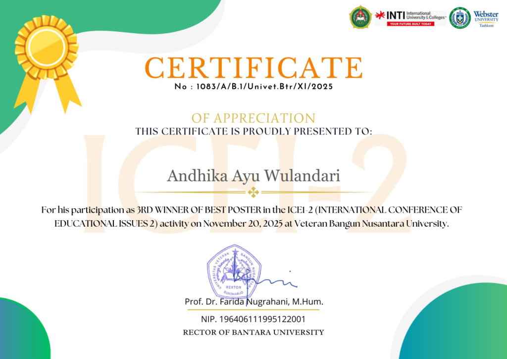 Prestasi membanggakan kembali ditorehkan oleh Pendidikan Matematika Universitas Veteran Bangun Nusantara (Univet Bantara). Poster hasil kolaborasi antara dosen dan mahasiswa Program Studi Pendidikan Matematika berhasil meraih Juara 3 dalam kategori Poster Terbaik pada ajang International Conference of Educational Issues 2 (ICEI-2) yang diselenggarakan pada 20 November 2025.