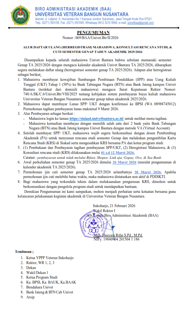 Informasi Alur Daftar Ulang Mahasiswa, KRS, dan Cuti Semester Genap TA 2025/2026