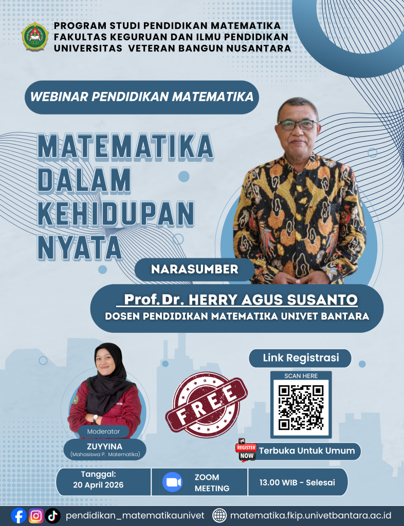 Halo sobat logic, Program Studi Pendidikan Matematika FKIP Univet Bantara akan mengadakan Webinar Pendidikan Matematika dengan tema